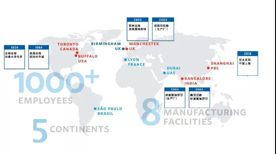 全球5大洲,5個大區(qū)總部,8個生產(chǎn)工廠,超過2000名員工。