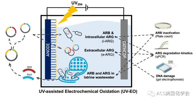 為了解決上述問題,加州理工學(xué)院hoffmann教授研究組和克拉克森大學(xué)楊陽教授研究組結(jié)合紫外光和高級氧化消毒的原理,開發(fā)了一種基于二氧化鈦藍色納米管(blue tio2nanotube arrays, bntas)材料的紫外光輔助電化學(xué)氧化(uv-assisted electrochemical oxidation, uv-eo)工藝,用于深度去除污水中arb及args。在該小試研究中,兩種args-四環(huán)素和磺胺甲惡唑抗性基因(teta和sul1),以及被它們分別轉(zhuǎn)化的耐四環(huán)素(tetracycline)和耐磺胺甲惡唑(sulfamethoxazole)大腸桿菌(escherichia coli, e. coli)經(jīng)由uv-eo處理后分別由qpcr和選擇性瓊脂培養(yǎng)基進行定量分析。與單一紫外光消毒相比,uv-eo有效增強了arb和args的去除效率。其中,由電化學(xué)氧化氯離子 (cl-)生成的自由氯以及隨后發(fā)生的紫外光和氯的光催化反應(yīng)使得去除效率被進一步提高。在cl-存在的條件下,uv-eo(uv-eo/cl-)基于光通量的一級動力學(xué)速率常數(shù)對長靶和短靶序列分別為單一紫外光輻照反應(yīng)下的 2.1-2.3和1.3-1.8倍。通過凝膠電泳和動力學(xué)模型計算,我們進一步解析了質(zhì)粒dna被不同自由基破壞的反應(yīng)機理。最后我們證明了uv-eo可以有效地消除廁所廢水中的arb和args,盡管反應(yīng)速率略低于模擬廢水實驗觀測值。