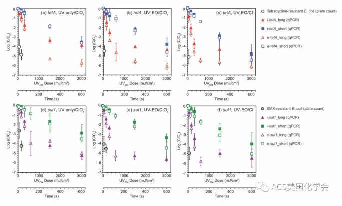 我們進一步測試了抗生素抗性大腸桿菌在三種不同反應(yīng)條件下(單一uv254、uv-eo/以及uv-eo/cl-)的去除效果(如圖4所示)。我們發(fā)現(xiàn)去除args比殺滅arb更具有挑戰(zhàn)性。這可能因為除了arg片段外,arb細胞中的全基因組dna序列中還有更多的“生死攸關(guān)”的靶點。此外自由基也可以通過破壞細胞其他結(jié)構(gòu)(細胞壁)達到滅活的目的。這個結(jié)果進一步印證了前人研究中的結(jié)論,即args可以在即使宿主arb被滅活的情況下幸存,從而繼續(xù)通過基因的水平轉(zhuǎn)移傳播抗生素抗性。我們的研究結(jié)果表明,與單一uv254工藝相比, uv/eo可借助自由基氧化反應(yīng)提高arb和args的去除效率。三種不同條件下arb和args的去除效率由高到低的順序為:uv-eo/cl-> uv-eo > uv 。對上述反應(yīng)條件下長靶和短靶序列的降解曲線在符合一級多力學(xué)的范圍內(nèi)分別進行一級動力學(xué)擬合,由此可得基于光通量的一級動力學(xué)常數(shù)。結(jié)果表明與單一uv254相比,uv-eo可將args長靶和短靶序列的降解速率分別提高至1.5-1.6和1.1-1.3倍。引入cl-可將其降解速率進一步分別提高至2.1-2.3和1.3-1.8倍。長靶序列由于含有更多的攻擊點位,其降解速率顯著高于短靶序列。此外,對于同一靶序列,e-args的降解速率普遍高于i-args,除了一組teta-short在單一uv254輻照下的降解實驗中e-args與i-args降解速率并無顯著不同之外。