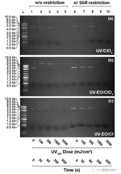 對上文提到的經(jīng)三種不同條件下處理了不同時間的質(zhì)粒peb1-sul1進行凝膠電泳測試(如圖5)。結(jié)果表明,在較低劑量的uv254輻照下,質(zhì)粒主要發(fā)生堿基對的改變。只有在足夠高劑量(> 1.5 j/cm2)的單一uv254輻照下,質(zhì)粒才會發(fā)生形態(tài)變化。而uv-eo顯著加速了質(zhì)粒的形態(tài)變化。