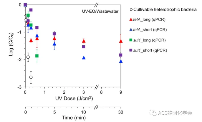 最后,我們測試了uv-eo 工藝的對廁所廢水中細菌和args的處理效果(如圖6)。實驗結(jié)果顯示,在300 mj/cm2的uv254輻照劑量下,廢水中的細菌的去除率達到2.7-log10。在600 mj/cm2的uv254輻照劑量下,兩個長靶序列teta-long和sul1-long的去除率分別達到1.1-log10和2.9-log10,而兩個短靶序列去除率接近2-log10。uv-eo對廢水中args的處理效率低于模擬廢水處理結(jié)果。原因可能包括1)自由基和游離氯被廢水中其他化合物(比如氨氮和有機物)消耗;2)紫外光被廢水中其他污染物吸收;3)廢水中細菌及args濃度遠低于模擬廢水。值得注意的是,我們發(fā)現(xiàn)uv-eo 可以在降解cod和氨氮之前優(yōu)先去除arb和args。