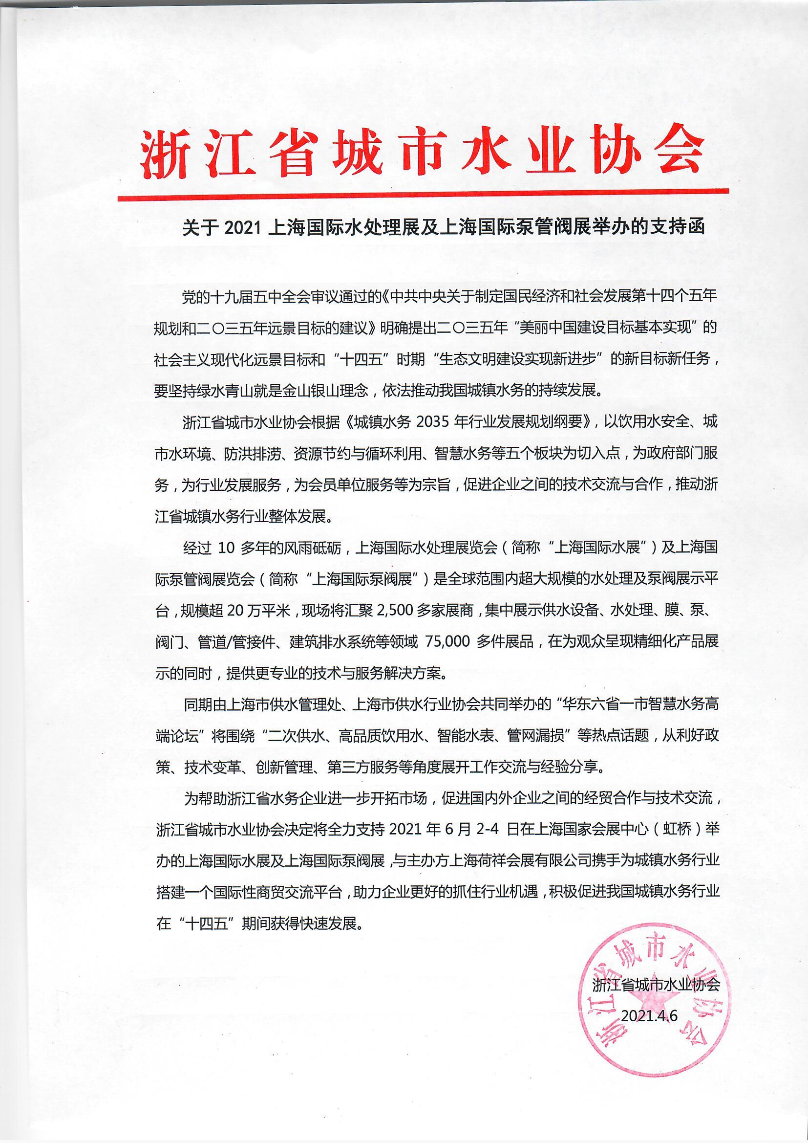 為幫助浙江省水務(wù)企業(yè)進一步開拓市場,促進國內(nèi)外企業(yè)之間的經(jīng)貿(mào)合作與技術(shù)交流,浙江省城市水業(yè)協(xié)會決定將全力支持 2021 年 6 月 2-4 日在上海國家會展中心(虹橋)舉辦的上海國際水展及上海國際泵閥展,與主辦方上海荷祥會展有限公司攜手為城鎮(zhèn)水務(wù)行業(yè)搭建一個國際性商貿(mào)交流平臺,助力企業(yè)更好的抓住行業(yè)機遇,積極促進我國城鎮(zhèn)水務(wù)行業(yè)在"十四五"期間獲得快速發(fā)展。