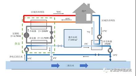 優(yōu)勢:污水處理廠出水比原污水具有更高的潛熱值,通過水源熱泵系統(tǒng)提取熱能也相對容易,可避免熱交換器(熱泵)防污、防堵、防腐構造等問題。