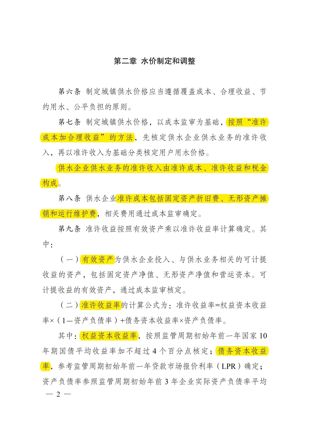 三是建立了參考市場利率合理確定供水收益率的機制。明確供水企業(yè)準(zhǔn)許收益率根據(jù)權(quán)益資本收益率、債務(wù)資本收益率確定,權(quán)益資本收益率按照10年期國債收益率加不超過4個百分點核定,債務(wù)資本收益率按照貸款市場報價利率確定,有利于吸引社會資本進入,促進供水行業(yè)健康持續(xù)發(fā)展。