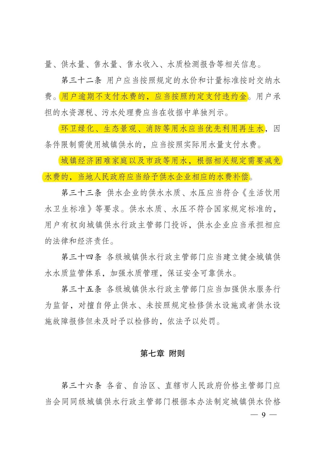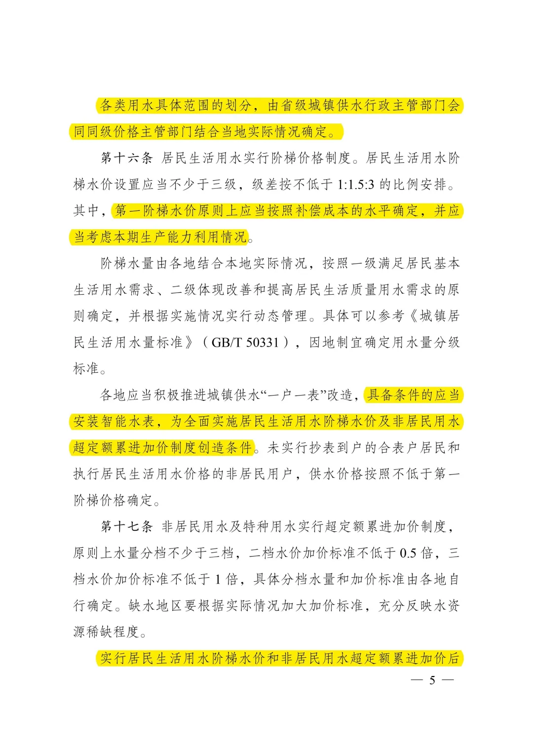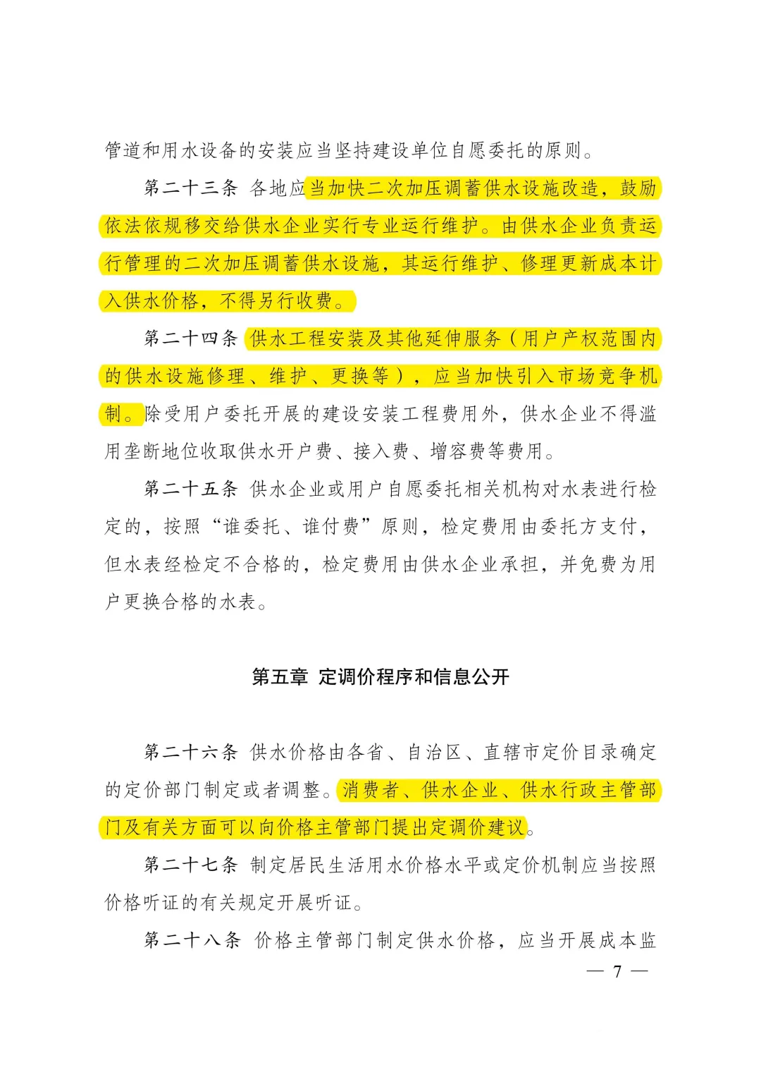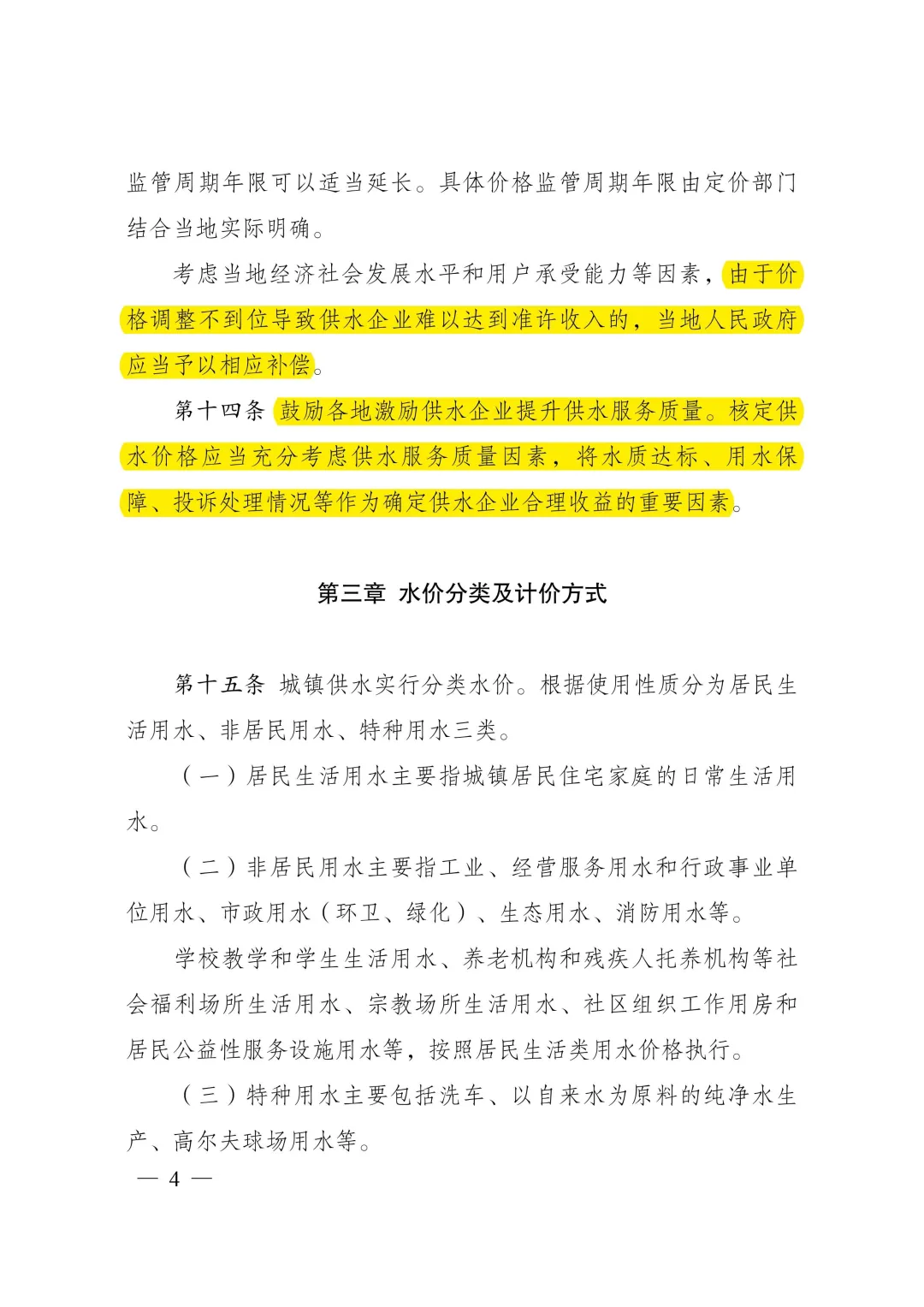 答:《城鎮(zhèn)供水價格管理辦法》明確了城鎮(zhèn)供水價格的定價原則、定價方法、定調(diào)價程序,以及水價分類、計價方式、規(guī)范供水企業(yè)服務(wù)收費行為等。主要內(nèi)容:一是按照“準(zhǔn)許成本加合理收益”的方法核定城鎮(zhèn)供水價格。制定城鎮(zhèn)供水價格,以成本監(jiān)審為基礎(chǔ),通過核定準(zhǔn)許成本、監(jiān)管準(zhǔn)許收益確定準(zhǔn)許收入,根據(jù)核定供水量確定供水價格,并統(tǒng)籌考慮當(dāng)?shù)毓┧聵I(yè)發(fā)展需要、促進節(jié)約用水、社會承受能力、服務(wù)質(zhì)量等因素。二是簡化水價分類、明確計價方式。城鎮(zhèn)供水根據(jù)使用性質(zhì)分為居民生活用水、非居民用水、特種用水三類,居民生活用水實行階梯水價制度、非居民用水實行超定額累進加價制度。三是規(guī)范定調(diào)價程序、強化信息公開。要求制定居民生活用水價格水平或定價機制應(yīng)當(dāng)按照價格聽證的有關(guān)規(guī)定開展聽證,并進行信息公開。四是規(guī)范服務(wù)收費行為、提升服務(wù)質(zhì)量。明確供水水質(zhì)、水壓應(yīng)當(dāng)符合國家規(guī)定標(biāo)準(zhǔn)。除受用戶委托開展的建設(shè)安裝工程費用外,供水企業(yè)不得濫用壟斷地位收取供水開戶費、接入費、增容費等費用。