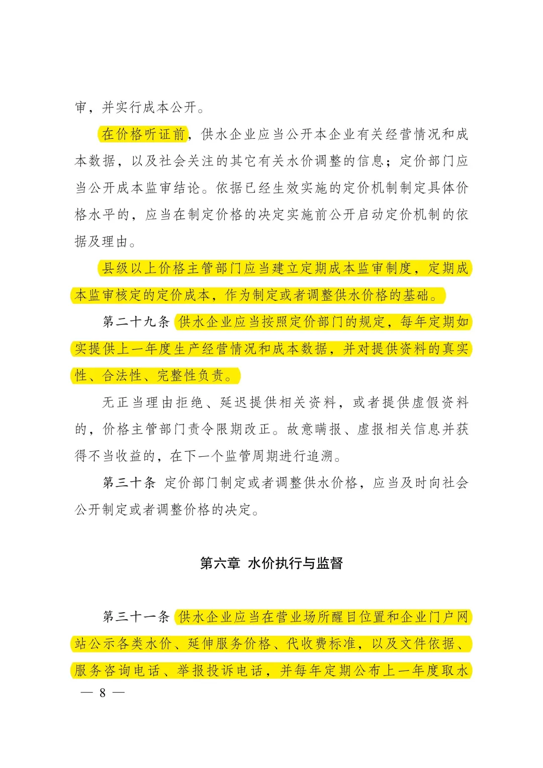 《城鎮(zhèn)供水定價成本監(jiān)審辦法》明確了定價成本構(gòu)成和核定方法。主要內(nèi)容:一是明確城鎮(zhèn)供水定價成本構(gòu)成范圍。按照合法性、相關(guān)性、合理性原則,規(guī)定城鎮(zhèn)供水定價成本包括固定資產(chǎn)折舊費、無形資產(chǎn)攤銷和運行維護費,并對計入定價成本的項目作了具體規(guī)定。二是明確定價成本和有效資產(chǎn)核定方法。細(xì)化明確固定資產(chǎn)折舊、原水費、材料費、動力費、人工費等成本費用的審核標(biāo)準(zhǔn),對可計提收益的有效資產(chǎn)范圍及其核定方法做出明確規(guī)定,對供水企業(yè)職工人數(shù)定員、管網(wǎng)漏損率控制等建立激勵約束機制。