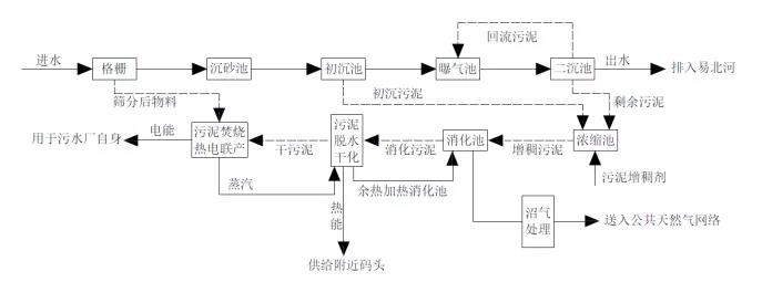 德國k?hlbrandh?ft/dradenau 污水處理廠位于德國漢堡,應(yīng)屬德國最大的污水處理廠,負責處理周邊200萬居民生活污水以及歐洲第三大海港工業(yè)廢水。處理水量達38.2×104m3/d(規(guī)模約為240萬當量人口,pe);進水水質(zhì)為:cod=850 mg/l,tn=67 mg/l,tp=9.4 mg/l。該廠由漢堡水務(wù)公司經(jīng)營,改造前是該市最大公共能源消耗單位之一。該廠主流處理工藝為活性污泥法,生化段出水投加化學藥劑除磷。污泥處理包括剩余污泥厭氧消化產(chǎn)沼氣、沼氣熱電聯(lián)產(chǎn)、消化后污泥繼續(xù)干化、焚燒用于能量回收。該廠污水、污泥處理全工藝流程如圖2所示。