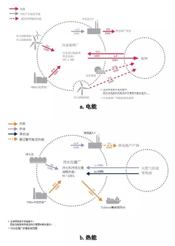 k?hlbrandh?ft/dradenau污水處理廠對剩余污泥進行厭氧消化,同時收集廠外生物廢棄物與污泥共消化以增加沼氣產(chǎn)量,并實現(xiàn)沼氣轉(zhuǎn)換為天然氣對外輸送。后續(xù)消化熟污泥施以焚燒處置,進一步熱電聯(lián)產(chǎn)回收電能和熱能;電能彌補自身電耗使用,熱能則被輸送至污泥干化設(shè)備,可完全滿足高溫干化需要;污泥干化后的低溫余熱可繼續(xù)供消化池保溫使用。如此設(shè)計,可實現(xiàn)電能與熱能高效回收利用。此外,自2009年起該廠富余熱能還向附近碼頭輸出供應(yīng)。圖3為該廠2018年電能與熱能流向示意圖。該廠污泥焚燒產(chǎn)能遠遠大于沼氣熱電聯(lián)產(chǎn),且應(yīng)用太陽能、風能等清潔能源,實現(xiàn)能源回收的同時進一步減少co2排放。2018年該廠總電耗為107.2 gw·h/a,產(chǎn)電量為115 gw·h/a,電能自給率達107%;總熱耗為99.7 gw·h/a,產(chǎn)熱量為113 gw·h/a,熱能自給率達113%??梢姡搹S通過自身進水中高濃度有機物(cod=850 mg/l)、外源有機廢棄物、太陽能、風能等綜合利用,已超越能源中和目標并可向外供氣(ch4)和熱。預計未來該廠將達到發(fā)電量大于耗電量的30%,熱能供應(yīng)范圍也將進一步擴大。
