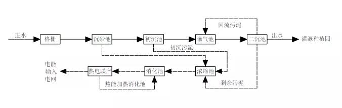 ①沼氣熱電聯(lián)產(chǎn)(chp)。該廠配備有4個污泥厭氧消化池,總池容6 200 m3。厭氧消化溫度控制為35 ℃,沼氣中ch4含量65%~68%。chp產(chǎn)生電能和熱能,其中,熱能用于加熱消化池,電能則輸入公共電網(wǎng)。