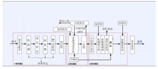 典型的污水廠處理工藝流程是上述方法的組合。以某一級a標(biāo)準(zhǔn)污水處理廠為例,從進水到出水主要分三級處理區(qū),一級處理區(qū)主要應(yīng)用物理法(包括攔截、沉淀、除砂等)及一定的化學(xué)法(初沉池前絮凝);二級處理區(qū)是污水處理工藝核心,主要是以活性污泥為主的生化反應(yīng)(酶促反應(yīng));三級處理區(qū)主要應(yīng)用物理化學(xué)法,通過混凝、過濾、消毒等工藝手段對污水進行深度處理。落實到具體處理工程中,各級各類技術(shù)需針對不同污染物和污染情況進行應(yīng)用和改進。