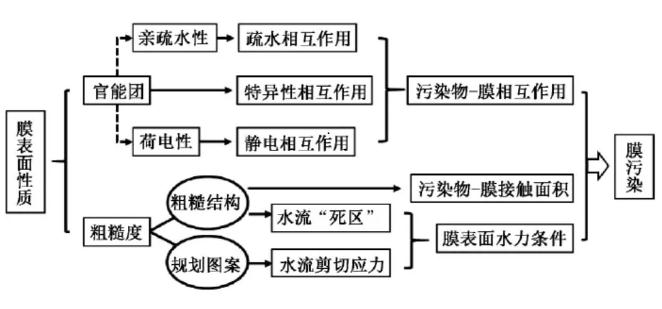 因此,全面總結(jié)膜污染與膜表面性質(zhì)相關(guān)性方面的研究進(jìn)展,對(duì)膜材料研發(fā)和膜污染控制具有重要的指導(dǎo)意義。根據(jù)污染物不同,膜污染類(lèi)型可分為有機(jī)污染、無(wú)機(jī)污染、結(jié)垢污染和生物污染4大類(lèi)。有機(jī)污染主要由進(jìn)水中的腐殖質(zhì)、多糖和蛋白質(zhì)等溶解性有機(jī)物導(dǎo)致,對(duì)應(yīng)膜污染研究中常用的模型污染物分別為腐殖酸(ha) 或富里酸(fa) 、海藻酸鈉(sa) 和牛血清蛋白(bsa) 。無(wú)機(jī)污染是由水體中的鋁、鐵、硅等無(wú)機(jī)膠體和微粒造成的污染,而結(jié)垢污染一般指的是鈣等二價(jià)陽(yáng)離子的碳酸鹽、硫酸鹽和磷酸鹽以及硅酸等物質(zhì)在膜表面的結(jié)晶或沉積。生物污染則由粘附在膜表面的微生物及其代謝產(chǎn)物引起,二者共同形成生物膜后會(huì)進(jìn)一步加重生物污染。在實(shí)際應(yīng)用中,通常出現(xiàn)的是由多種污染物共存造成的復(fù)合污染,并且進(jìn)水水質(zhì)的差異也會(huì)導(dǎo)致膜污染的主要類(lèi)型有所不同。影響膜污染行為的關(guān)鍵性質(zhì)主要包括膜表面的親疏水性、荷電性、官能團(tuán)種類(lèi)以及粗糙度(詳見(jiàn)圖1) 。前3項(xiàng)理化性質(zhì)決定了膜材料與特定污染物之間的疏水作用、靜電作用以及氫鍵等特異性相互作用,而膜表面粗糙度則通過(guò)粗糙結(jié)構(gòu)、規(guī)則圖案等形貌特征影響污染物與膜的接觸面積以及錯(cuò)流過(guò)濾時(shí)膜表面的水力條件。