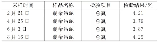 微生物在生長繁殖過程中,會攝取污水中一部分氮來合成自身細(xì)胞組分,采用《城鎮(zhèn)污水處理廠污泥檢驗方法》(cj/t 221-2005)第49章中的方法對剩余污泥中氮含量進行檢測,檢測時間為2020年,檢測結(jié)果見表1。