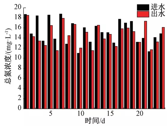 再生水廠以3.75萬m3/d規(guī)模生物池為研究對象,控制該生物池污泥濃度為6 500 mg/l、水溫23 ℃、混合液回流比為500%、生物池好氧區(qū)前、中、后段do分別為1.5 mg/l、1.2 mg/l以及0.5 mg/l。對好氧段進出水的總氮濃度變化進行檢測,結(jié)果如圖1所示。