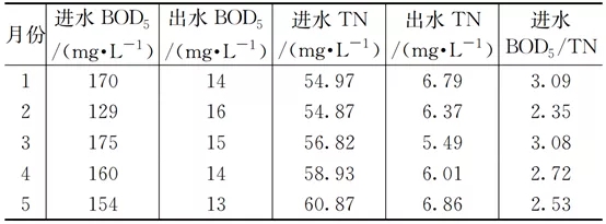 然而在實際運行過程中,受回流液中do濃度的影響,反硝化效率很難達到理論值。如表2所示,再生水廠2021年1月至5月進水bod5/tn的平均值為2.75,低于2.86的理論值。日常該水廠生物池內(nèi)回流比為350%左右,按照式(2)計算理想狀態(tài)下的脫氮效率為78%,在未投加外加碳源的情況下生物系統(tǒng)實際反硝化脫氮效率為77%(見表3)??紤]剩余污泥排放中攜帶的氮含量,進水總氮平均去除率為89%。