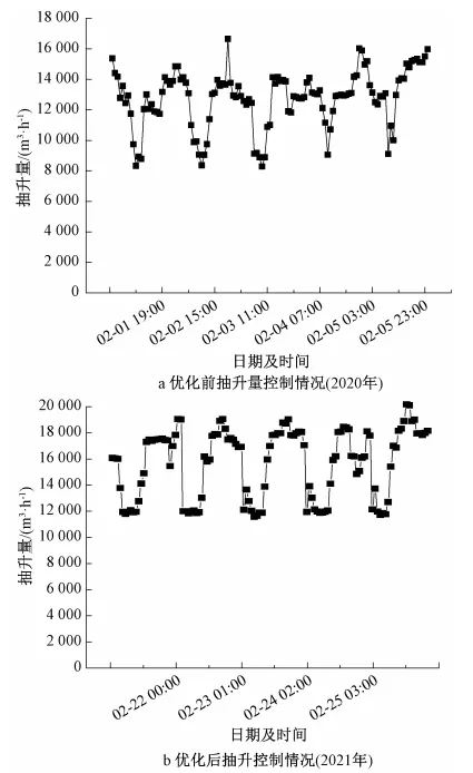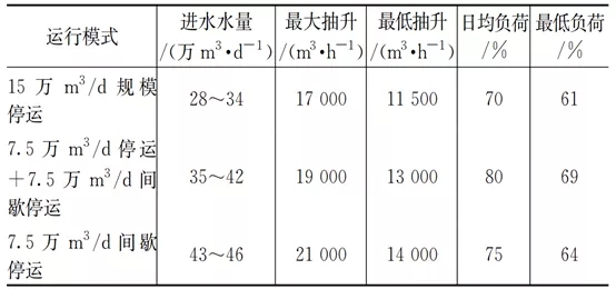 再生水廠結(jié)合來水時變化及日變化規(guī)律,通過生物池及膜池間歇停運的方式(見表4),提高日水力負(fù)荷至70%以上。并充分利用上游污水管網(wǎng)調(diào)蓄功能,控制瞬時最低抽升量不低于運行曝氣池負(fù)荷的60%(見圖3b)。