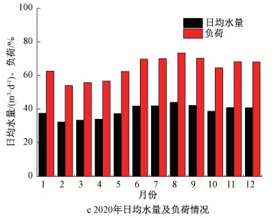 受城市生產(chǎn)活動的影響,污水處理廠在實際運行過程中不同時段、季節(jié)來水水量呈規(guī)律性波動。水力負(fù)荷過低或水量時變化系數(shù)過大對回流液do濃度、內(nèi)回流比等脫氮重點指標(biāo)控制會帶來一定困難。以再生水廠2020年來水情況為例,水量峰谷差值比例超過50%(見圖3a),瞬時最低負(fù)荷僅為設(shè)計值的30%。不同月份水量差異也較為明顯,最低負(fù)荷僅為設(shè)計值的53%(見圖3c)。