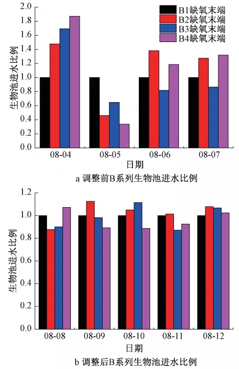 如圖5所示,開展配水優(yōu)化工作后,各生物池間進水均勻度明顯提升,同一系列各生物池間進水比例差值由33%降低至15%左右。