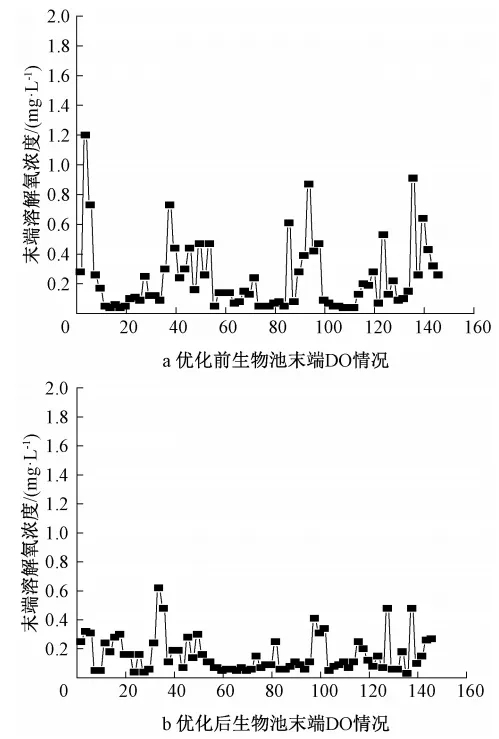 通過配水優(yōu)化、抽升控制、生物池倒運等方式,穩(wěn)定生物池水力負(fù)荷。優(yōu)化后,生物池do穩(wěn)定性明顯提高(見圖6b),末端do濃度基本低于0.5 mg/l,滿足反硝化對于do濃度的要求,同時大大降低了回流液中的do對于進水碳源的浪費。
