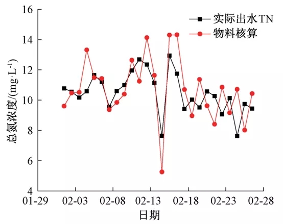 以再生水廠2020年2月份的實際出水tn與物料平衡方程模擬出水tn進行對比,結(jié)果如圖7所示。