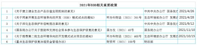 2021年,從政策層面的進一步明確到試點推進的不斷加深,eod模式落地加速。根據(jù)環(huán)境商會觀察,一是2021年全年,相關政策陸續(xù)發(fā)布,對eod的支持力度加大。