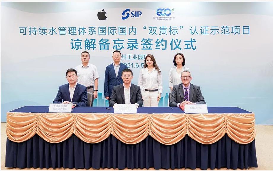 2021年6月5日,蘇州工業(yè)園區(qū)管理委員會(huì)與蘋果公司、天津泰達(dá)低碳經(jīng)濟(jì)促進(jìn)中心簽署諒解備忘錄,共同推動(dòng)全球首例、國內(nèi)首個(gè)產(chǎn)業(yè)園區(qū)可持續(xù)水管理體系國際國內(nèi)“雙貫標(biāo)”認(rèn)證示范項(xiàng)目在園區(qū)落地。