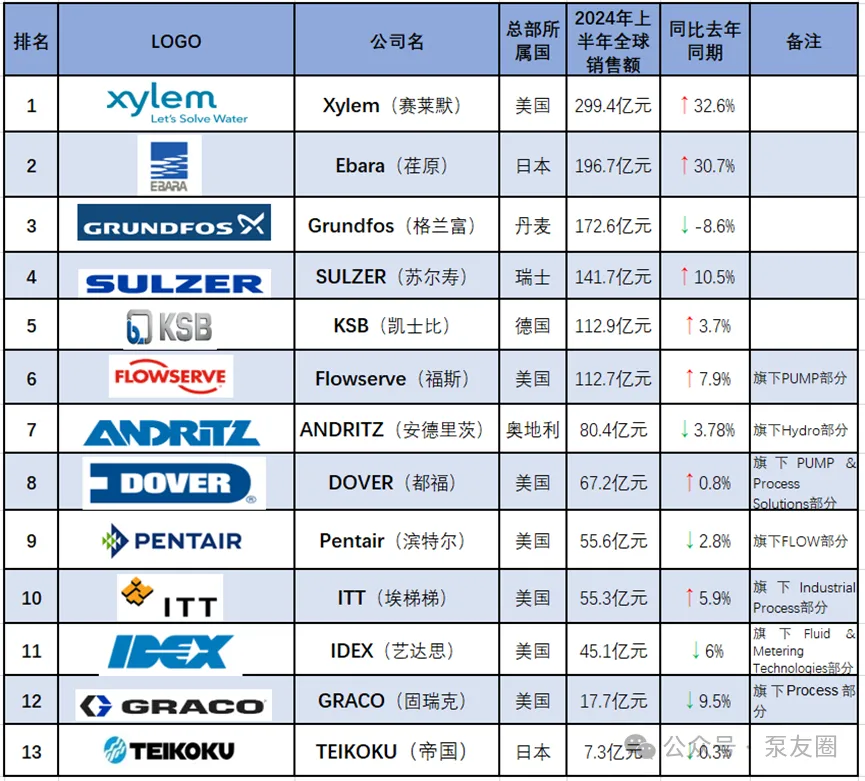 隨著2024年半年報(bào)的陸續(xù)發(fā)布,根據(jù)統(tǒng)計(jì),納入?yún)R總的13家國(guó)際知名泵企,其上半年總銷售額達(dá)到約1264.6億元人民幣,相較于去年同期的1051.74億元,總體實(shí)現(xiàn)了20.2%的同比增長(zhǎng)。在這13家企業(yè)中,尤為值得關(guān)注的是,僅有3家企業(yè)實(shí)現(xiàn)了兩位數(shù)以上的強(qiáng)勁增長(zhǎng),共有7家企業(yè)實(shí)現(xiàn)了與去年同比有增幅。