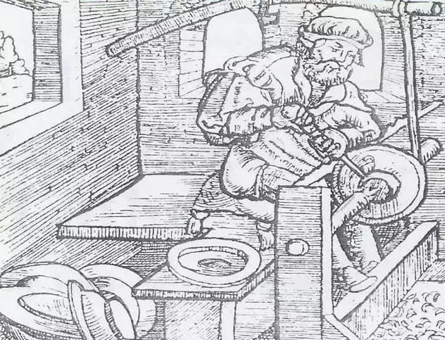 這本書里也記載了磨床的結(jié)構(gòu),這里利用了類似歐洲中世紀(jì)腳踏機(jī)床的原理,用腳踏的方法使金屬盤旋轉(zhuǎn),配合沙子和水來加工玉石。